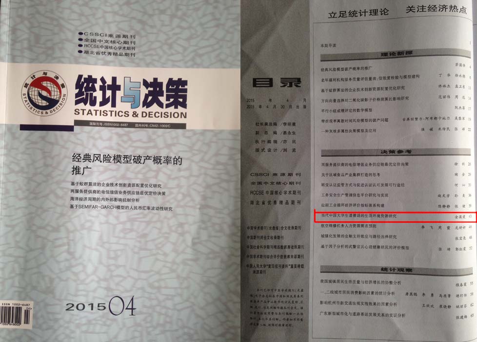 近日,公司社工系金英爱老师在《统计与决策》2015年第4期发表论文《当代中国老员工道德观的生活环境资源研究》,该论文为太阳集团城87222014年度教学研究与改革立项重点项目(01051101)“高等学校分层动态式德育体系构建研究”的阶段性成果。