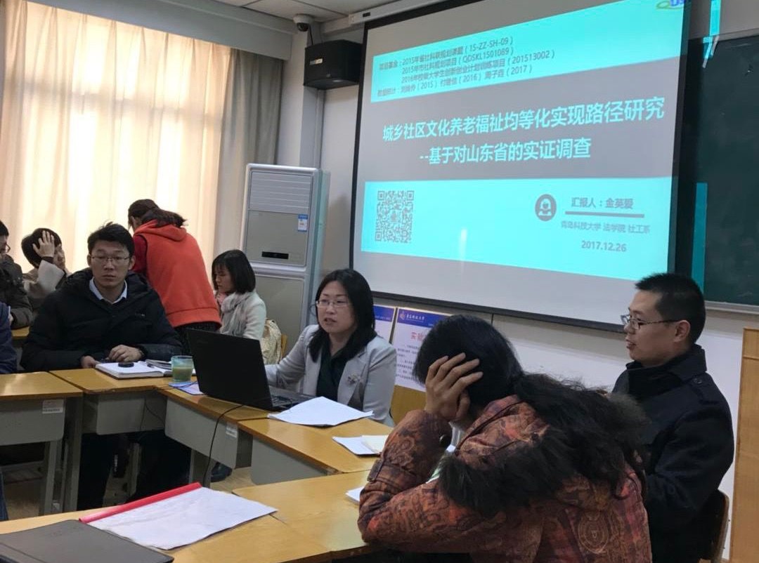 12月26日下午,太阳集团城8722举办了第八期“教师学术沙龙”,由社会工作系的金英爱老师作了题为“城乡社区文化养老福祉均等化实现路径研究——基于对山东省的实证调查”的主题发言。
