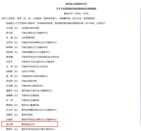 近日,山东省“齐鲁和谐使者”选拔管理工作办公室组织评选出第四届“齐鲁和谐使者”,公司社会工作系徐从德副教授成功入选。