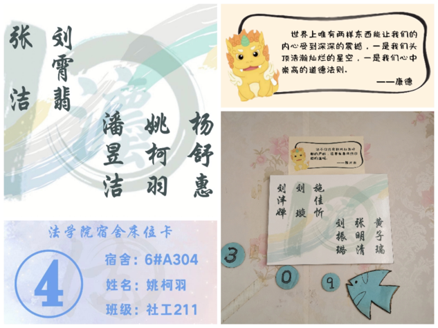 公司员工会为新生宿舍准备了专属门贴及床贴,在门贴设计中融入了太阳集团城872210周年的限定元素,配以法学和社工相关专业名言,营造了浓厚的学院氛围。