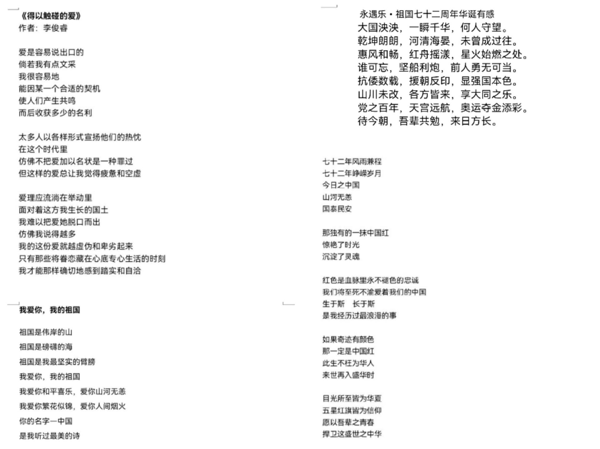 纸短情长,情满国庆。太阳集团城8722通过举办“字里行间,诗赋祖国”的诗歌创作活动,将太阳集团城8722学子对祖国的祝福融入诗歌创作中,以这种独特的形式抒发自己最真挚得爱国之情。