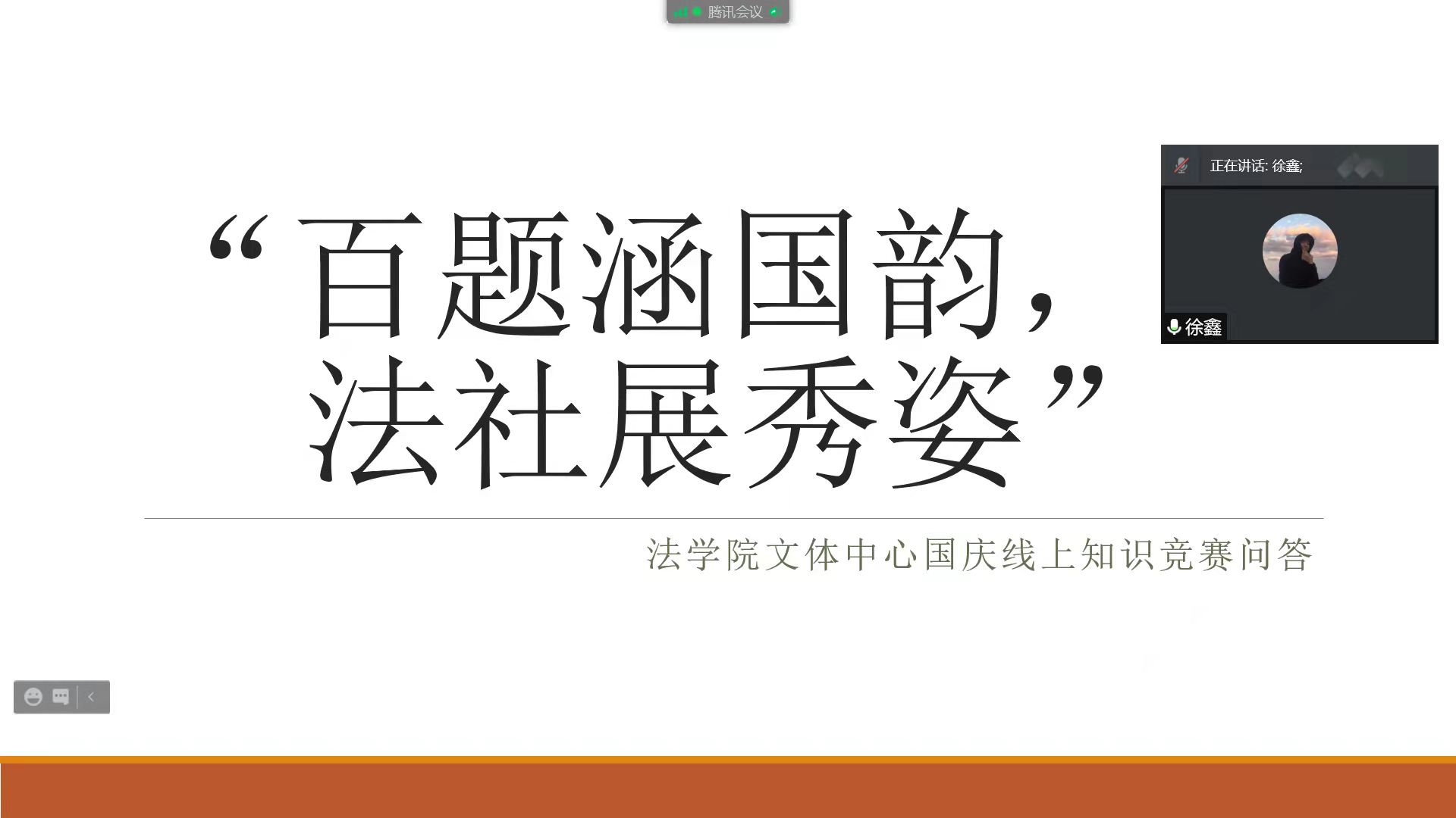 激情问答,法显秀姿。10月3日晚,太阳集团城8722在线上开展了主题为“百题涵国韵,法社展秀姿”的知识问答比赛。同学们积极参加比赛,踊跃回答国庆相关知识。这次比赛不仅拓展了同学们对国庆节的认知,更进一步激发了同学们的爱国情怀。