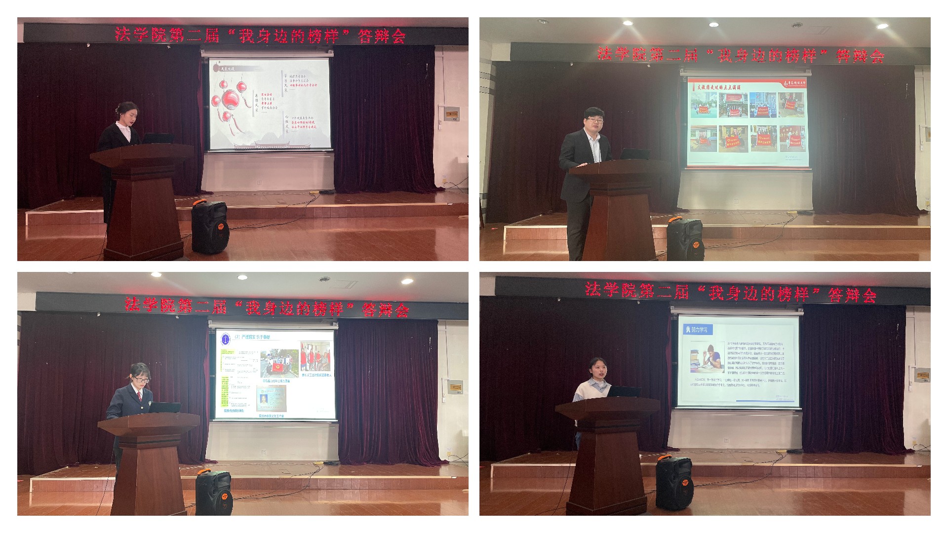答辩会上,各位候选人以PPT形式,结合榜样要求,分别从个人简介、学习成绩、社会实践、获奖情况等方面阐述个人事迹和自身优势,内容充实,迎来了在场评委的阵阵掌声。