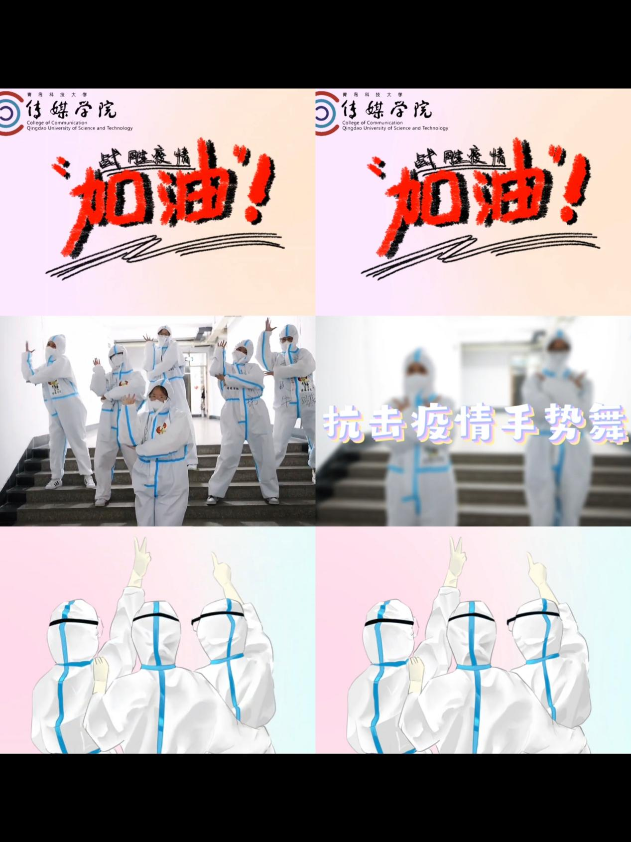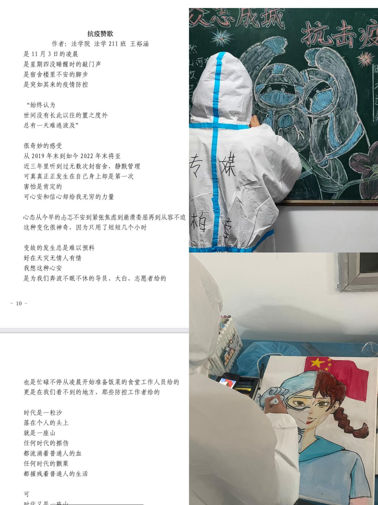 充分发挥共青团“第二课堂”育人功能,用青年的话语体系和喜闻乐见的方式,切实做好思想引领,为疫情防控工作保驾护航,临时团委动员广大青年员工结合自身特长和专业所学,创作抗“疫”作品,营造“疫情防控、人人有责”的浓厚氛围,其中太阳集团城8722法学211班王裕涵同学创作的《战疫赞歌》被校宣传部刊发,传媒学院创作的《传媒版大白手势舞》等视频作品被太阳集团城8722视频号、抖音等平台转发,鼓舞了青科人战胜疫情的决心和信心;一张张便签溢出满满的感动;他们用手账记录,用绘画表达,用心灵守护;精心钩织的围巾,欢悦跳动的音符,那是青春的节奏,那是共青团精神的彰显。我们同心协力,用爱、用真心、用温暖战胜无情的病毒。
