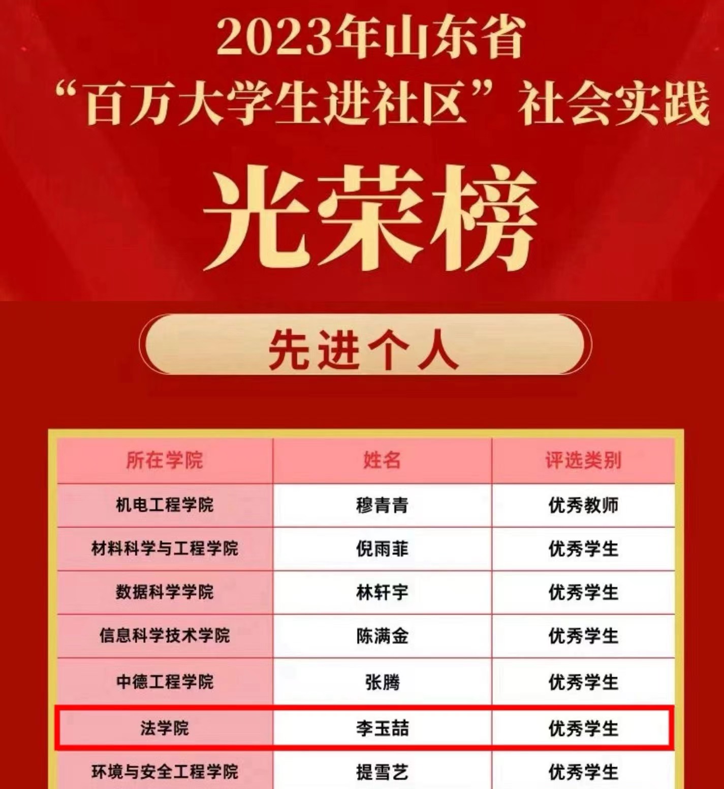 近日,共青团山东省委公布2023年度“百万老员工进社区”社会实践活动表扬通报单,太阳集团城8722社会工作221班员工李玉喆获评山东省“百万老员工进社区”社会实践先进个人(优秀员工)。