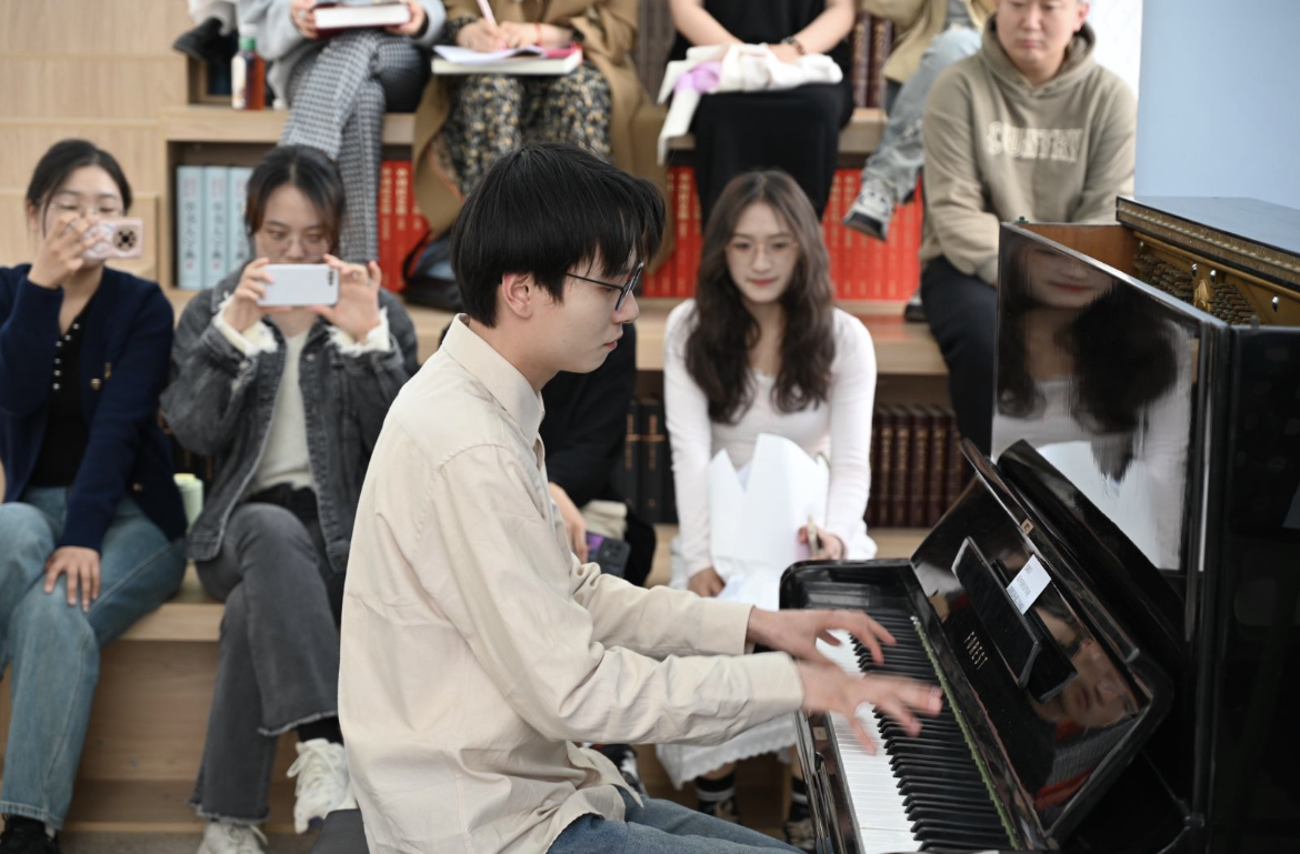 沈佳成以一首《梦中的婚礼》为开场曲,将同学们带入音乐的故事中,并依次带来莫扎特的《土耳其进行曲》、贝多芬的《献给爱丽丝》、肖邦的《夜曲》等大师名曲。在演奏的间歇,沈佳成讲述各个钢琴名家的作曲背景与个人风格,分享钢琴演奏的技法与音乐学习中的领悟所感。此外,沈佳成还结合同学们音乐兴趣,演奏了《大鱼》《春舞》《遇见》等曲目,并带来了自己的原创曲目《水晶曲》《杨妃》等。