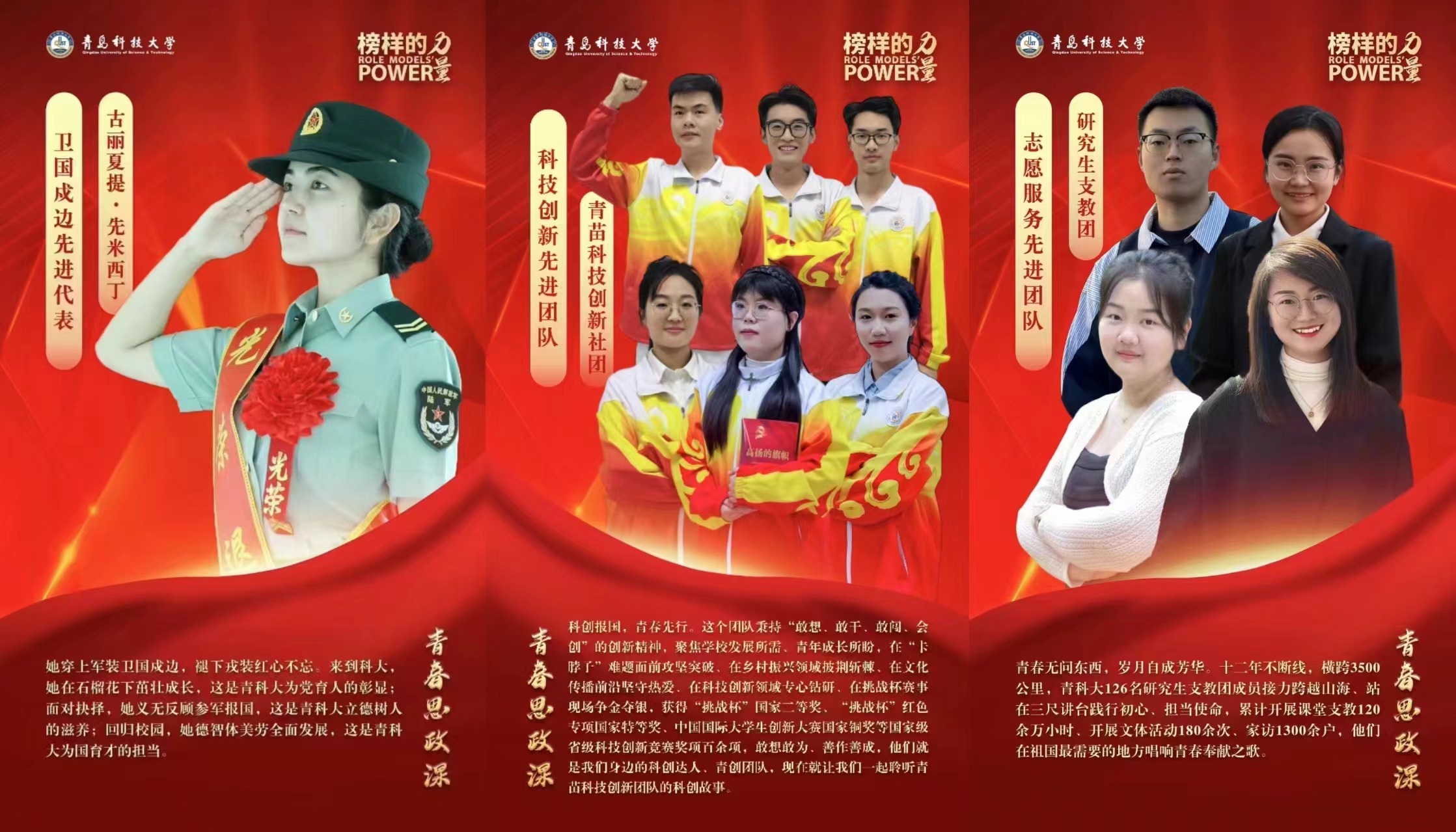 穿上军装卫国戍边,褪下戎装红心不忘。2022级本科生古丽夏提·先米西丁作为卫国戍边先进代表讲述《青春筑梦 戎马芳华》的参军报国故事;2023级研究生公维瀚作为科技创新先进团队代表讲述《青春筑梦 科创报国》的奋斗前行之路,在文化传播前沿坚守热爱,以敢想敢为、善作善成的奋斗精神践行青春筑梦、强国有我的使命担当;2020级本科生王嘉玥参与志愿服务先进团队演绎《十二载接力跨越山海》,作为研究生支教团的一员喊出“到西部去,到祖国最需要的地方去”的铮铮誓言。