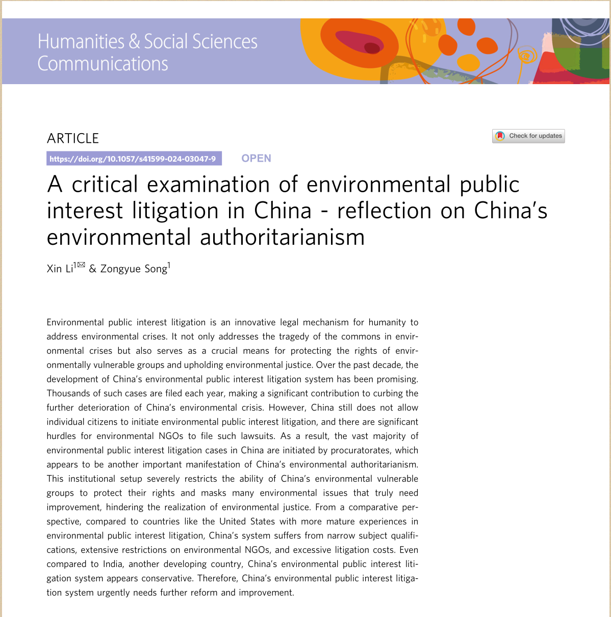 太阳集团城8722李鑫教授团队在Humanities & Social Sciences Communications期刊2024年5月发表学术论文“A critical examination of environmental public interest litigation in China - reflection on China’s environmental authoritarianism”。该论文的第一作者及通讯作者为李鑫教授,第二作者为李鑫教授指导的硕士研究生宋宗越。Humanities & Social Sciences Communications(《人文与社会科学通讯》)为Social Sciences Citation Index(SSCI)以及Arts& Humanities Citation Index(A&HCI)两个权威数据库源刊,致力于人文科学、社会与行为科学所有领域的高水平研究,具有良好的全球影响力。Humanities & Social Sciences Communications(《人文与社会科学通讯》)位于国际JCR分区一区,中国科学院期刊分区社会学大类二区。