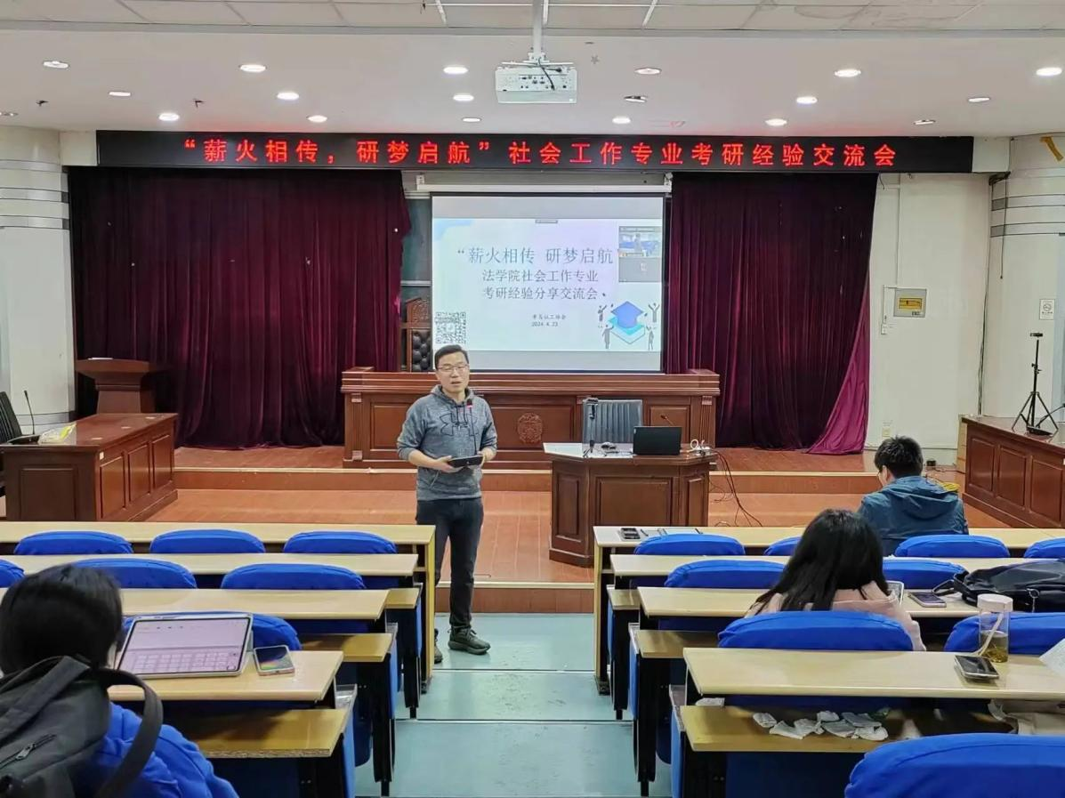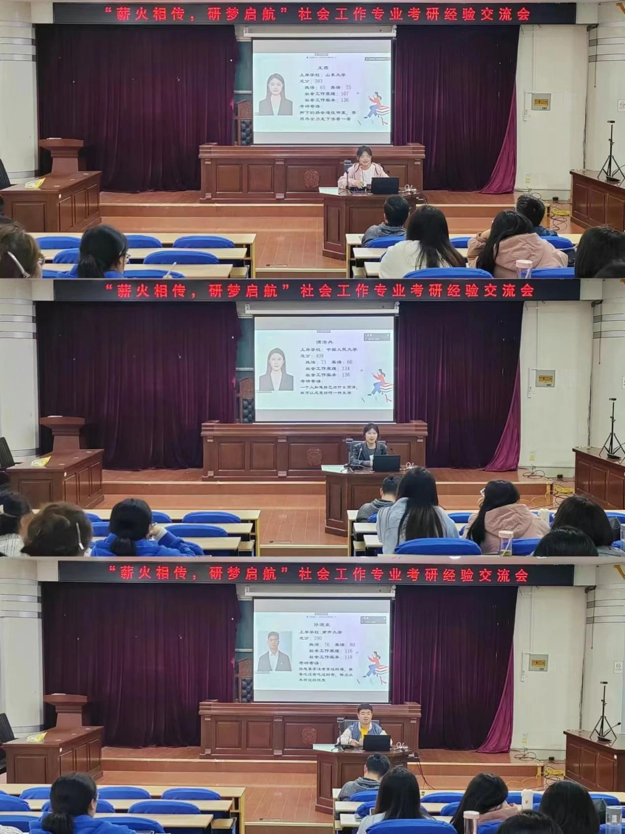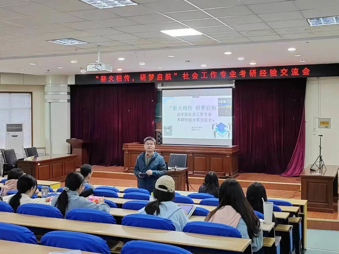 新一届的考研学子们即将踏上备考之路,为帮助同学们认清当前考研形势、明确考研目标、增强考研信心、做好考研规划、完善考研方法,太阳集团城8722青鸟社会工作协会于4月23日下午在弘毅楼A201模拟法庭举办了以“薪火相传、研梦起航”为主题的考研经验交流会。社会工作专业各年级同学积极报名参加,高密校区社会工作专业员工也通过线上方式参与活动。社会工作系老师刘琰、张行、杭帆等亲临现场指导,9位考研成功上岸的同学进行具体的考研经验分享交流。
